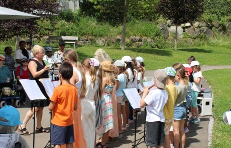 Bei strahlendem Sonnenschein spielte eine gut gelaunte und kunterbunte Kinderschar ein wunderbares Flötenkonzert im GERBE-Park.