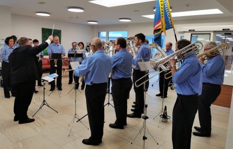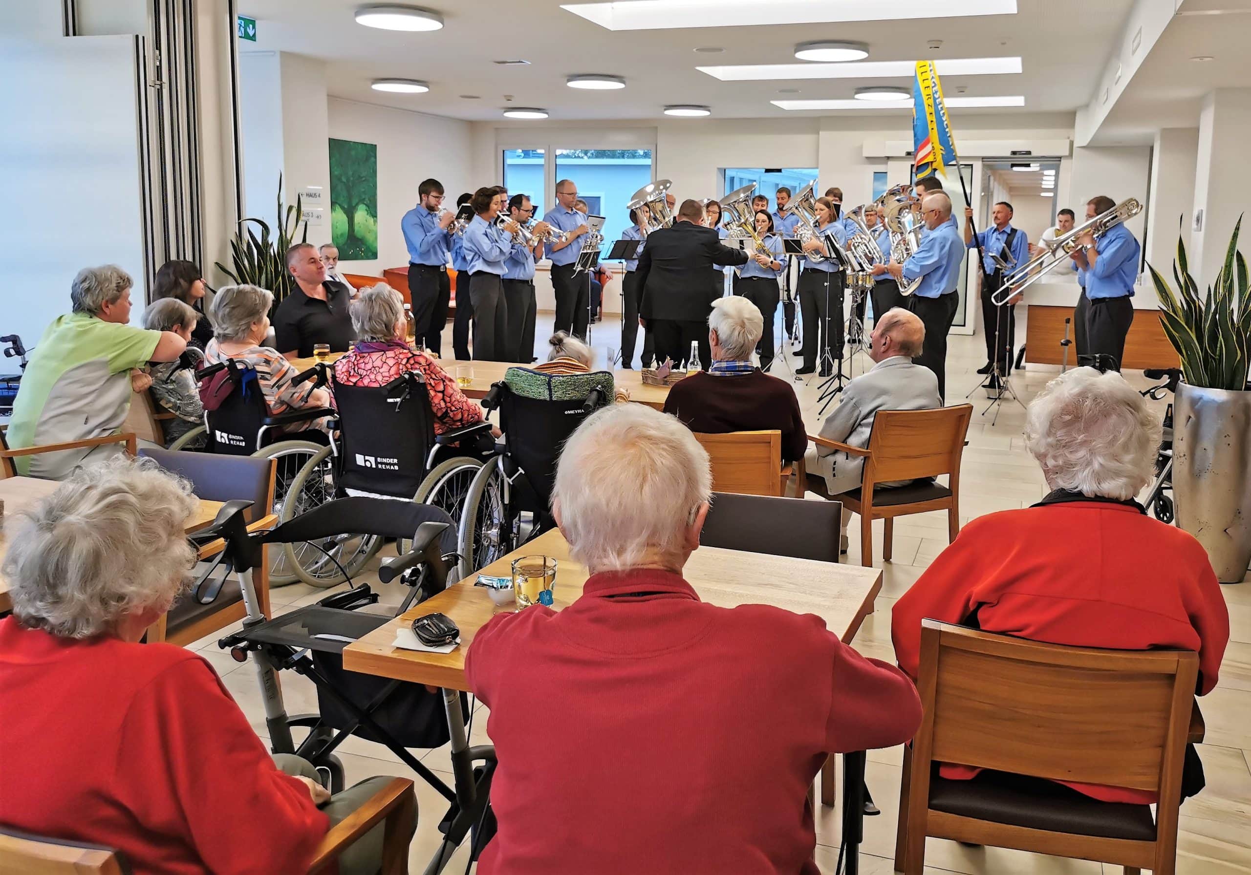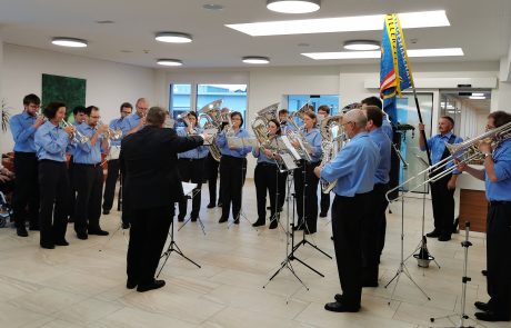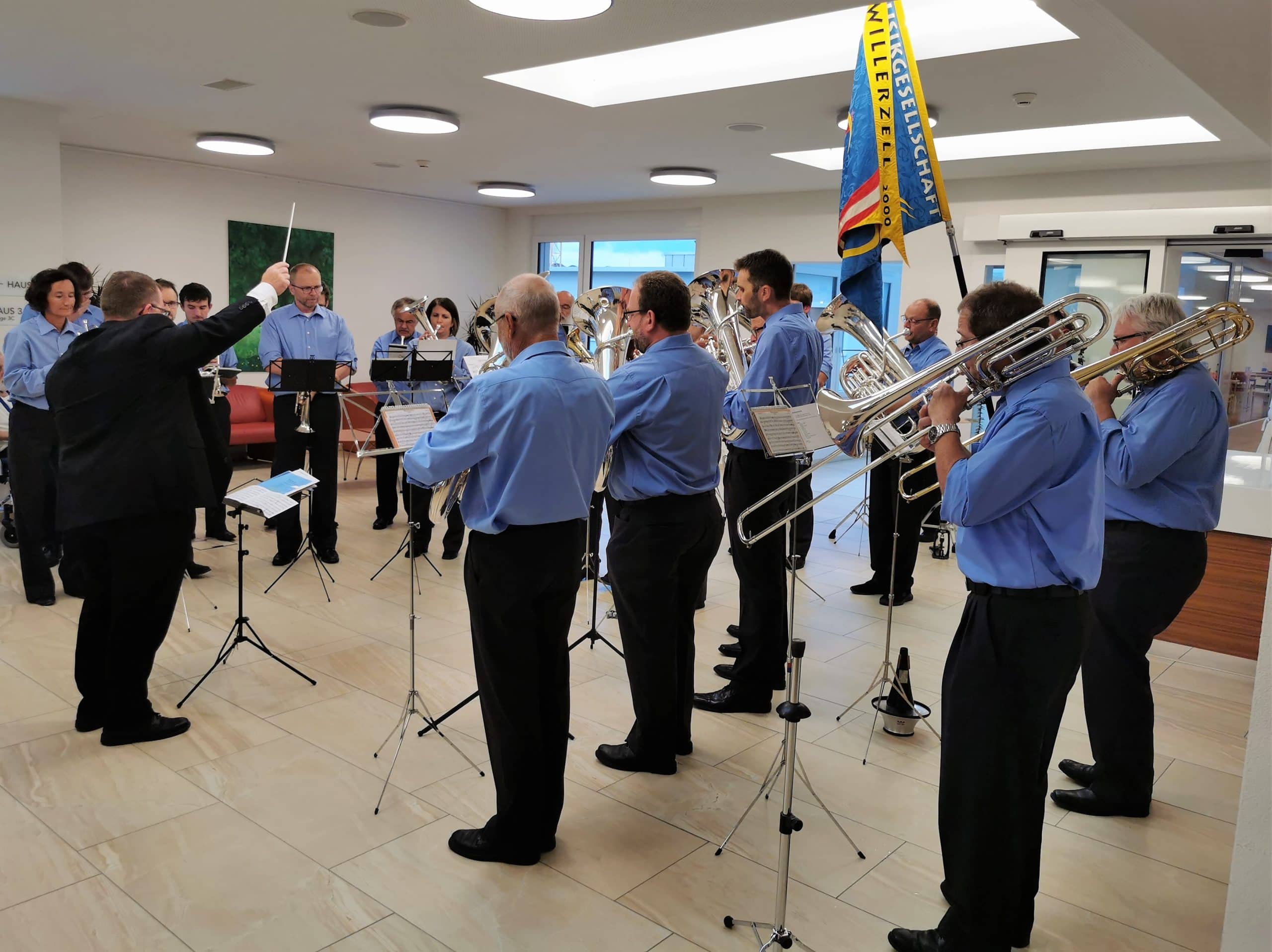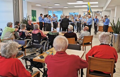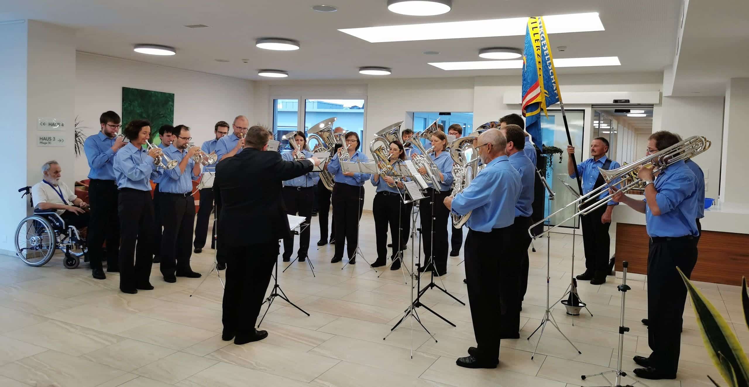 Am letzten Mittwoch besuchte uns die Brass Band Willerzell. Da das Wetter nicht ganz so wollte wie wir, unterhielten uns die Musikantinnen und Musikanten in der Cafeteria. Unsere Bewohnerinnen und Bewohner genossen das Ständli der Brassband Willerzell trotzdem sehr. Herzlichen Dank an die ganze Brassband für das musikalische «Bettmümpfeli», wir alle haben uns darüber gefreut.